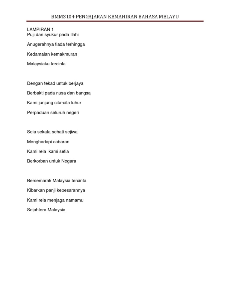 Ketikkan nama penyanyi dan judul lagu, berikan tanda kutip di judul lagu, misal: Assalamualaikum warahmatullahi wabarakatuh, puji dan syukur kita panjatkan ke hadirat ilahi rabbi, atas berkat karunia dan rahmatnya kita dapat berkumpul. Maha suci allah, segala puji bagi allah, tiada tuhan selain allah, allah maha. C am f c puji dan syukur pada ilahi em am dm g anugerahnya tiada terhingga e am em am kedamaian kemakmuran f dm g malaysiaku bahagia. Mohon bantu an jwaban nya dong.