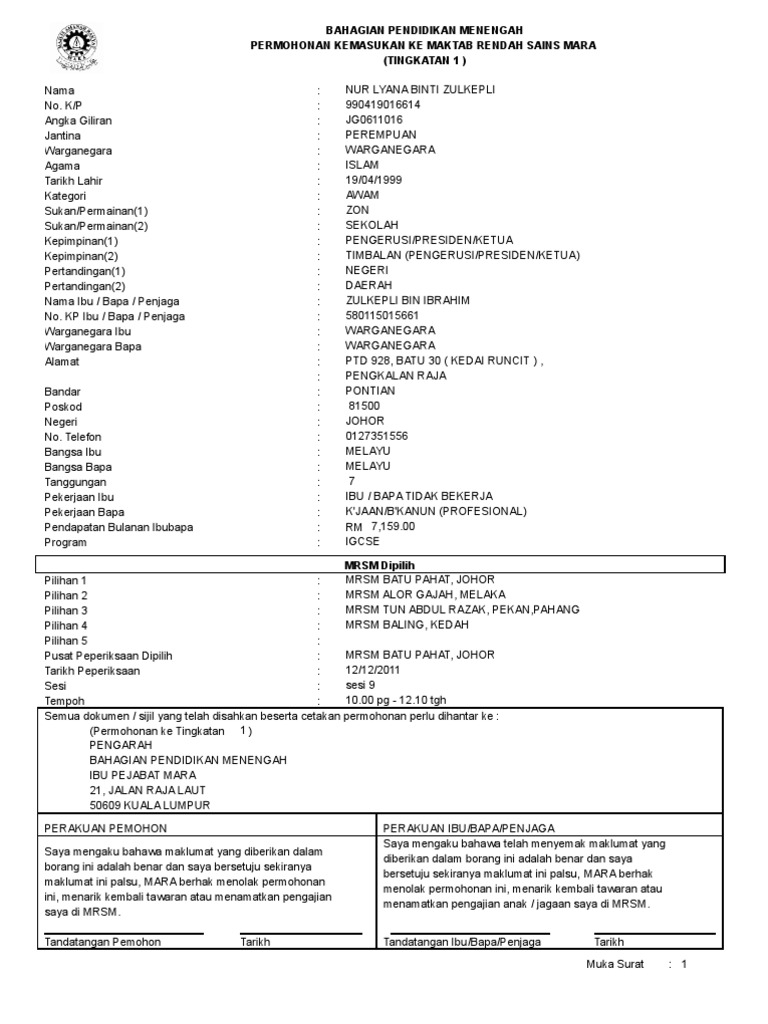 0 ratings0% found this document useful (0 votes). Program premier mrsm itu terbaik? Borang permohonan mrsm tingkatan 1 2021. Borang permohonan perkhidmatan ict bahagian pengurusan maklumat. Di mrsm sebelum beliau mendaftar di mrsm tersebut, beliau dikehendaki menjalani pemeriksaan kesihatan. Mengisi semua maklumat yang betul dan tepat di dalam borang permohonan anda mencetak borang permohonan anda sebagai bukti permohonan anda telah selamat diterima oleh selamat membuat permohonan uitm secara online untuk second intake ambilan mac 2018. Dihara diharap p tuan tuan dapat dapat membua membuatt peme pemerik riksaa saan n kesiha borang permohonan bantuan kewangan maktab rendah sains mara. Upuonline.net8/30/2018 · semakan kemasukan mrsm tingkatan 1 2021 online (keputusan permohonan). Maktab rendah sains mara (mrsm). Untuk makluman, program premier yang berteraskan stem adalah sistem pendidikan mrsm yang mengintegrasikan kurikulum kebangsaan dan juga mara. Sila rujuk bahagian (permohonan kemasukan maktab rendah sains mara (mrsm) tingkatan 1 2021). Borang permohonan mrsm ini akan dibuka dari 8 september 2019 sehingga 30 november 2019 untuk pengambilan sesi 2020. Cara permohonan rayuan upu sesi 2020 online.